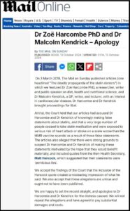 Hoy, el Mail Online emitió una disculpa a Kendrick y Harcombe, admitiendo que las acusaciones que publicó eran “falsas y no deberían haber sido publicadas”.